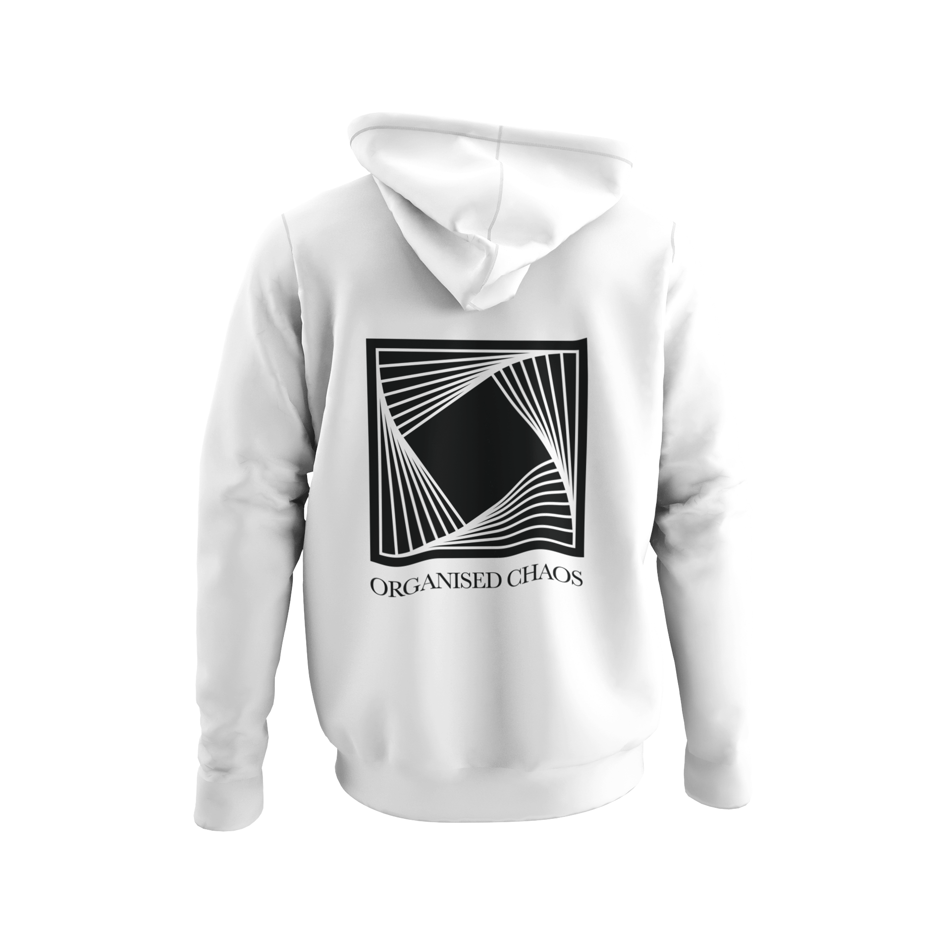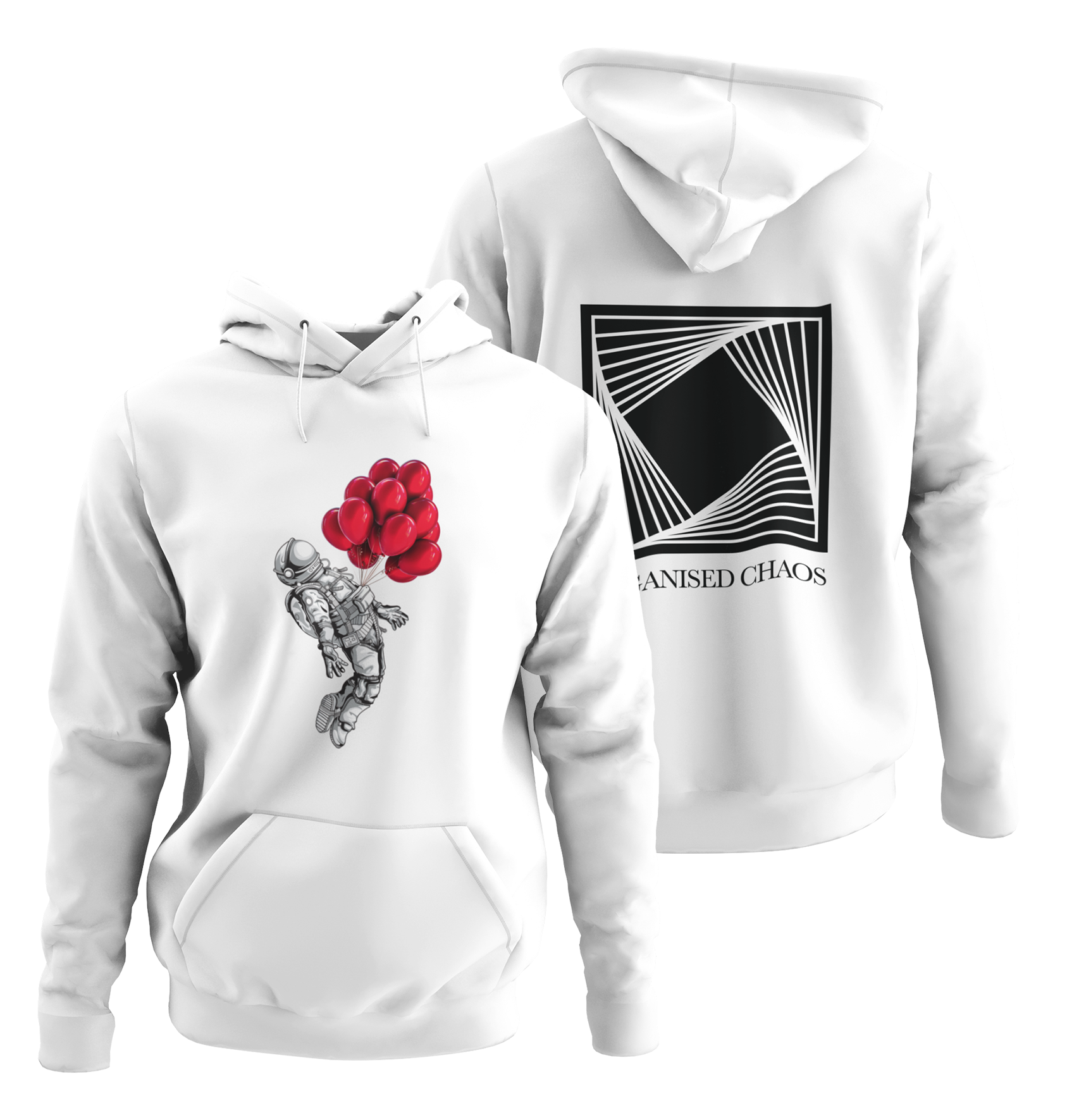 Long sleeves hooded sweatshirt in white with the "ORGANISED CHAOS" logo printed on the back. The "BALLOONS ASTRONAUT" printed on the front. Kangaroo pocket. White strings.
