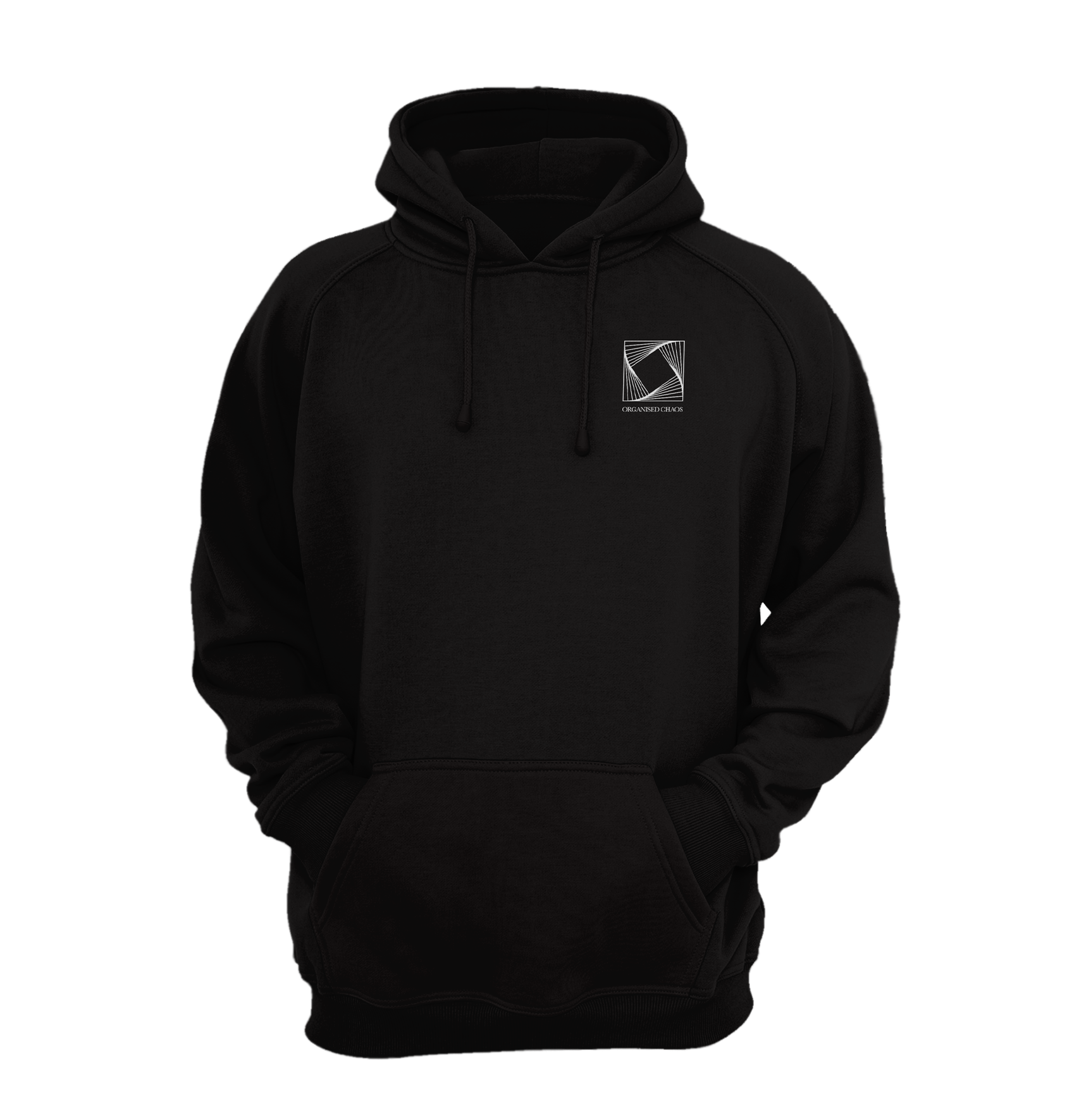 Long sleeves hooded sweatshirt in black with the "ORGANISED CHAOS" logo embroidered on the front. Kangaroo pocket. Black strings.